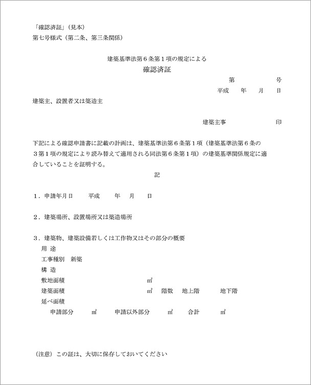 住宅などの建築物をつくる時、「確認済証」と「検査済証」という書類が必ず必要になります。工事の前にこの設計で建てて良いか、自治体や民間の審査機関に申請してもらえるのが「確認済証」で、これが無いと工事に着手することができません。(1999年に建築基準法が改正され、「確認通知書」から「確認済証」という名称に変わっていますが同様の書類です)また、完成時に設計通りちゃんと建てられているか検査を受け、合格するともらえるのが「検査済証」です。