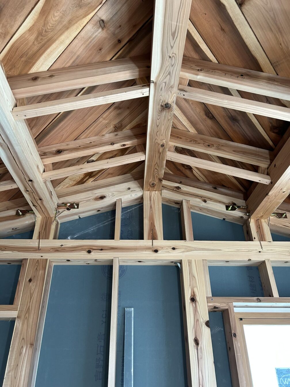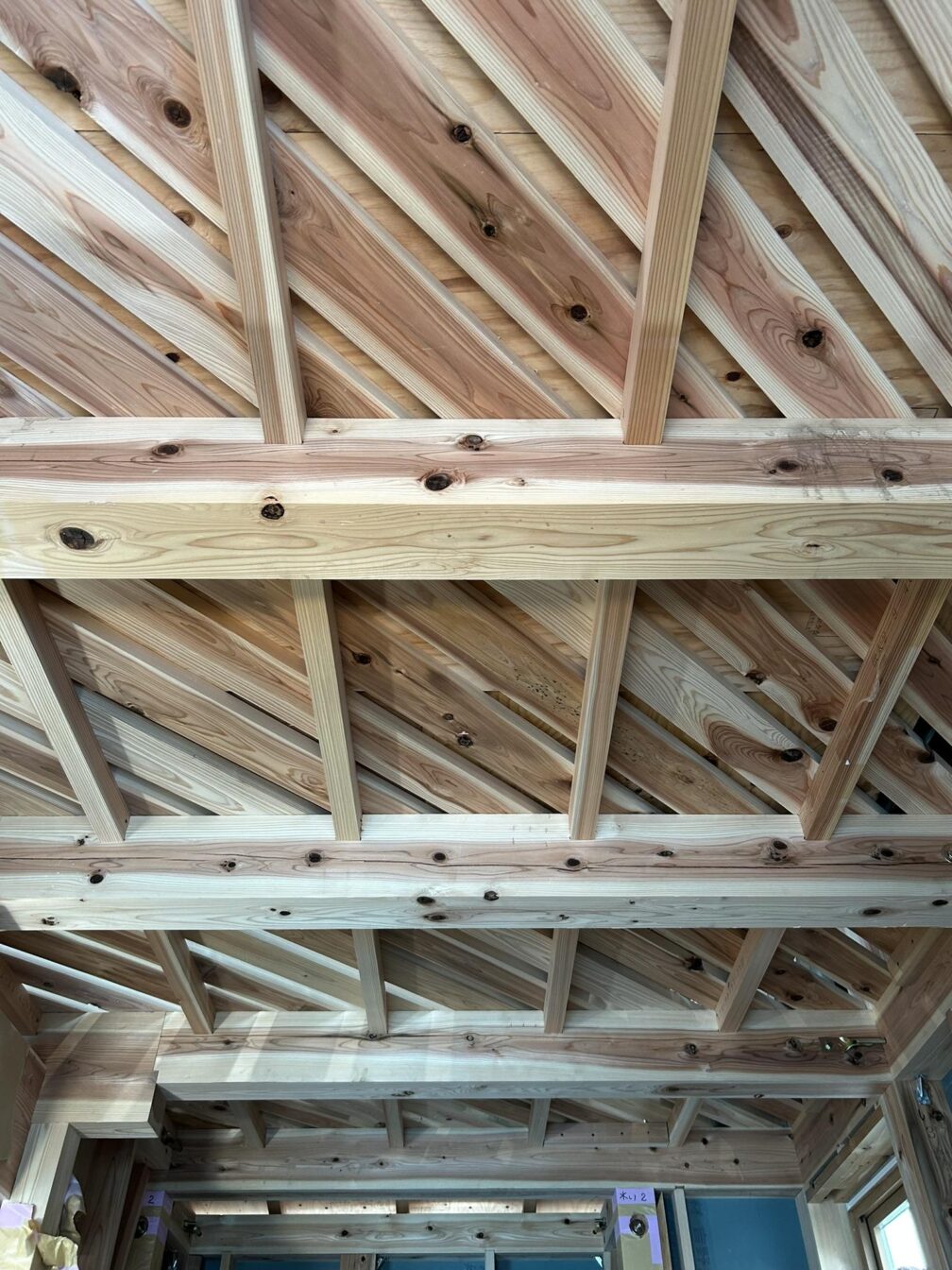こちらの木の家では、屋根面や2階床に、構造用合板ではなく、杉の製材を斜めにはったグリーンエア工法が採用されています。